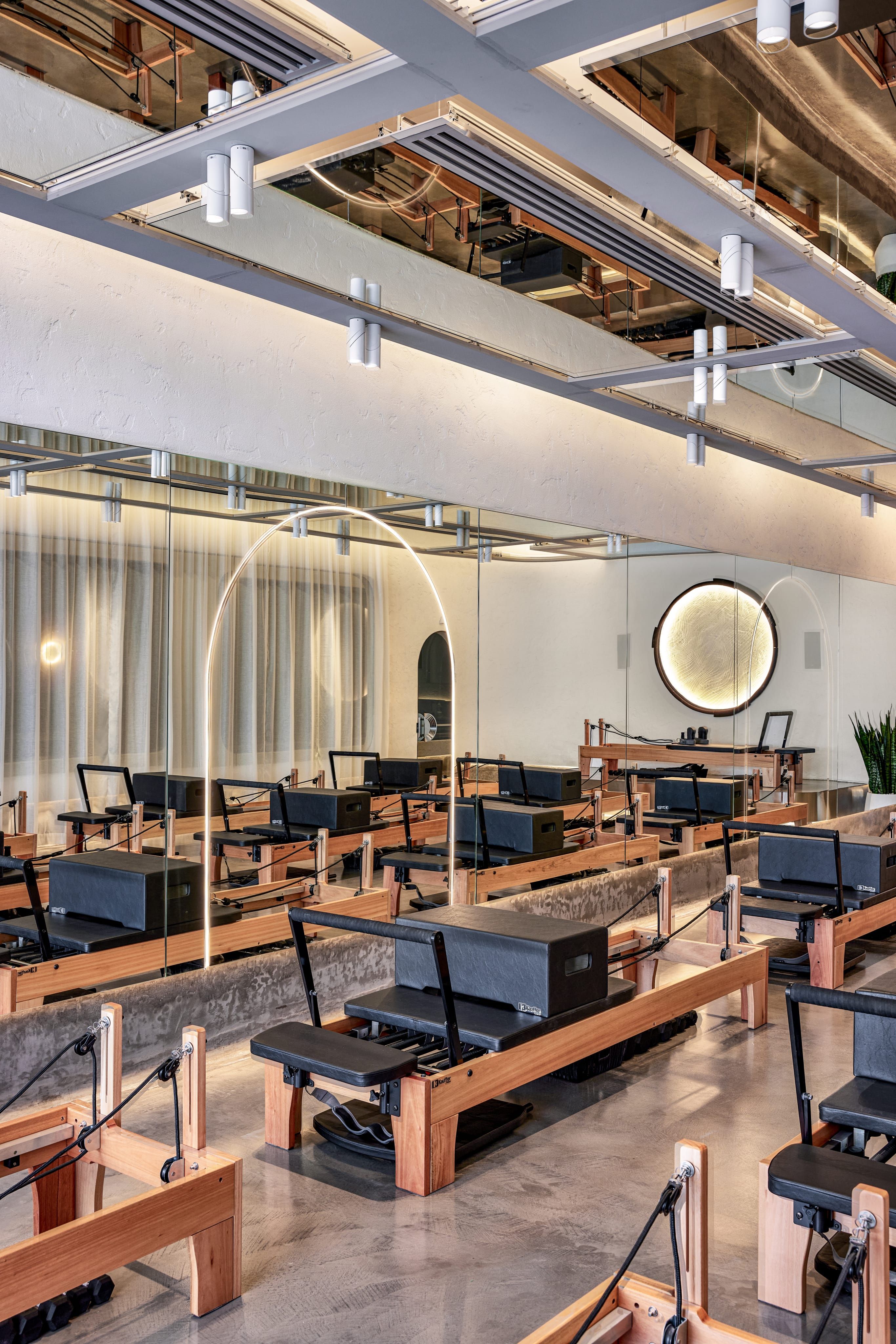 Our Reformer Studio is filled with natural light, reformer beds, an elevated stage for instructor visibility, and mirrors above each bed to help correct your technique.